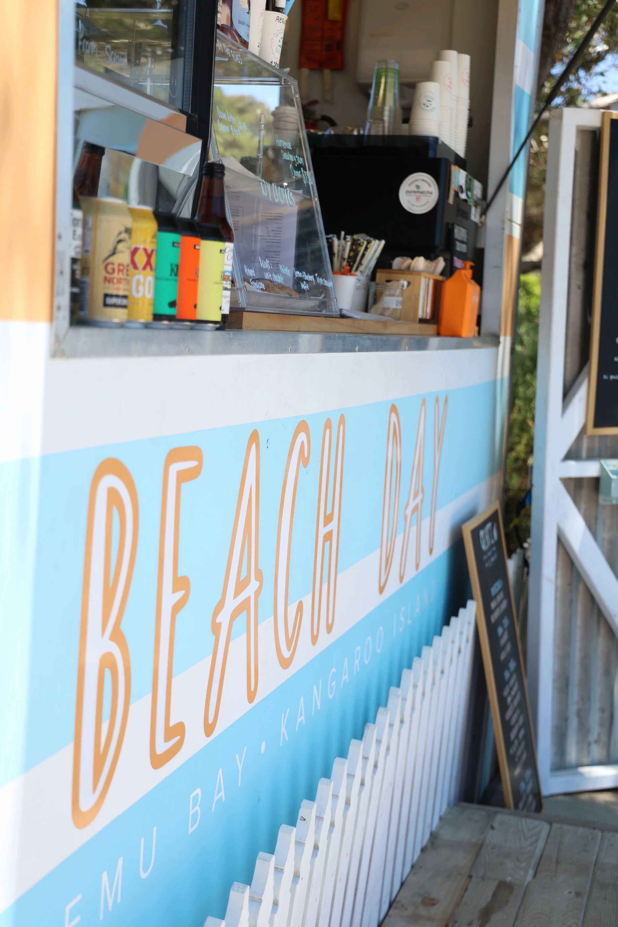 Beachside pop up licensed cafe and bar at Emu Bay serving coffee, hot food, ice cream, cocktails, local wines & beers, and housemade baked goods